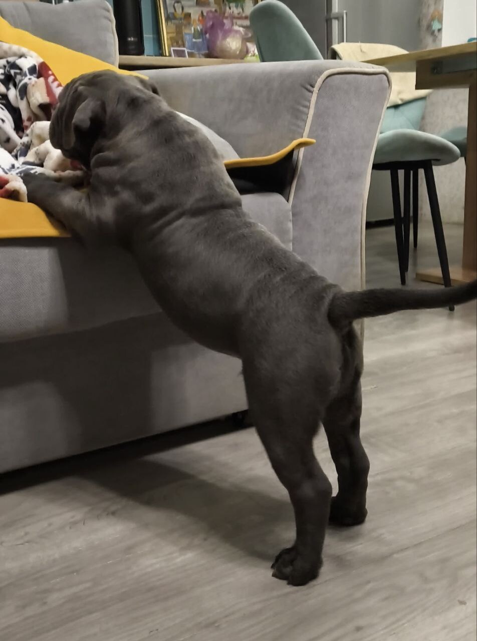 Стеллан -самый крупный кобель в помёте, рожденный первым, ошеломляющий. Ласковый ,ориентированный на своего человека, очень умный и игривый. Мячики ,канатики, пуллеры, баклажки всё это он обожает.